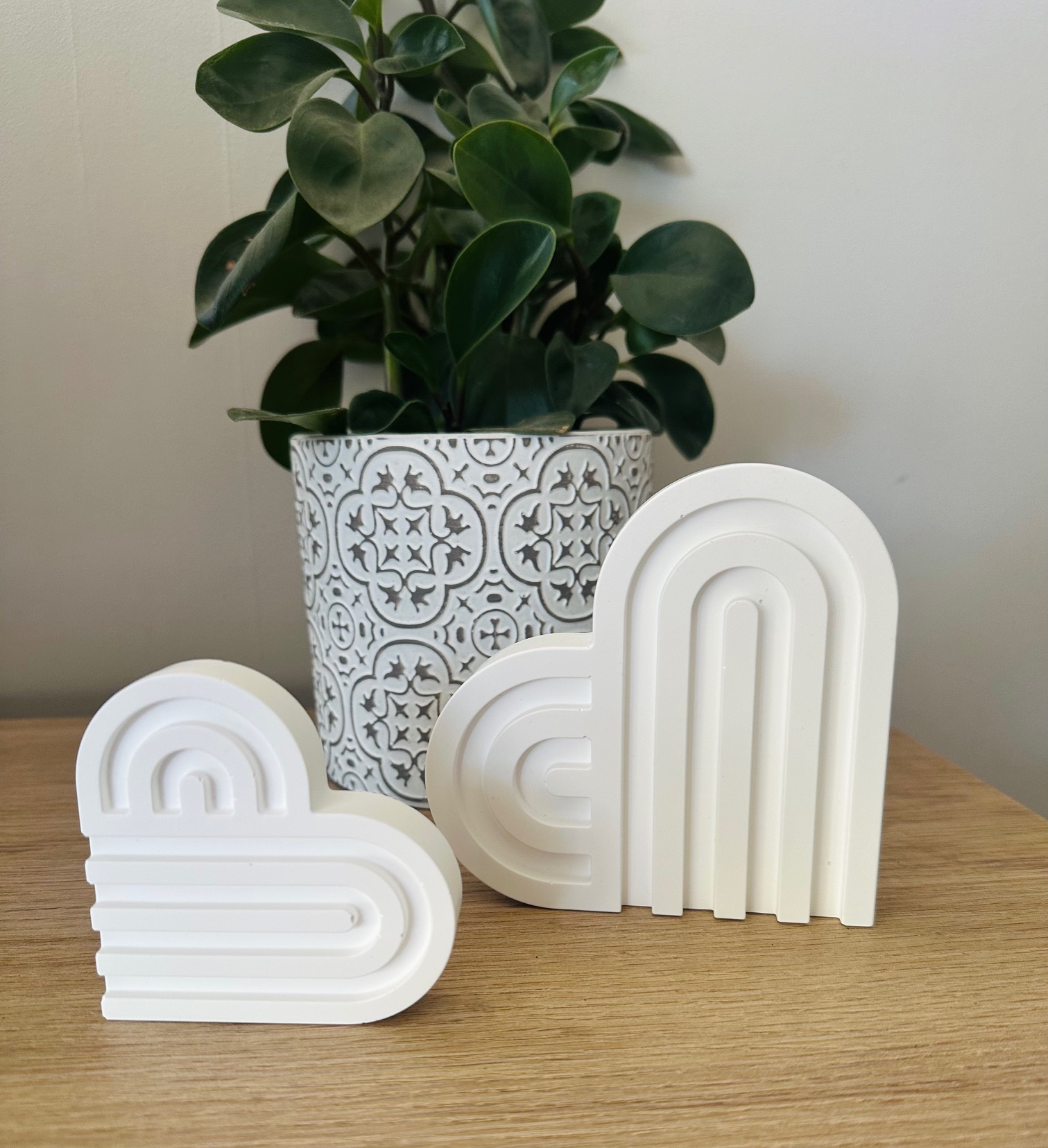 Our textured hearts are hand mixed, hand poured white plaster resin and come in small and large sizes. They can be placed on either side depending on how you would like the pattern.